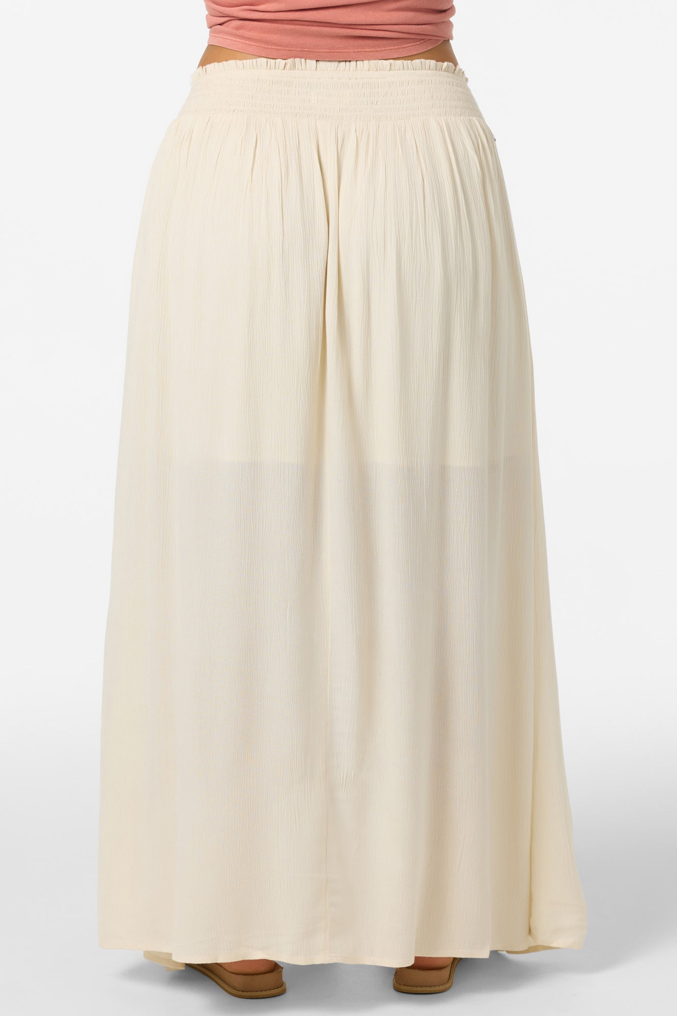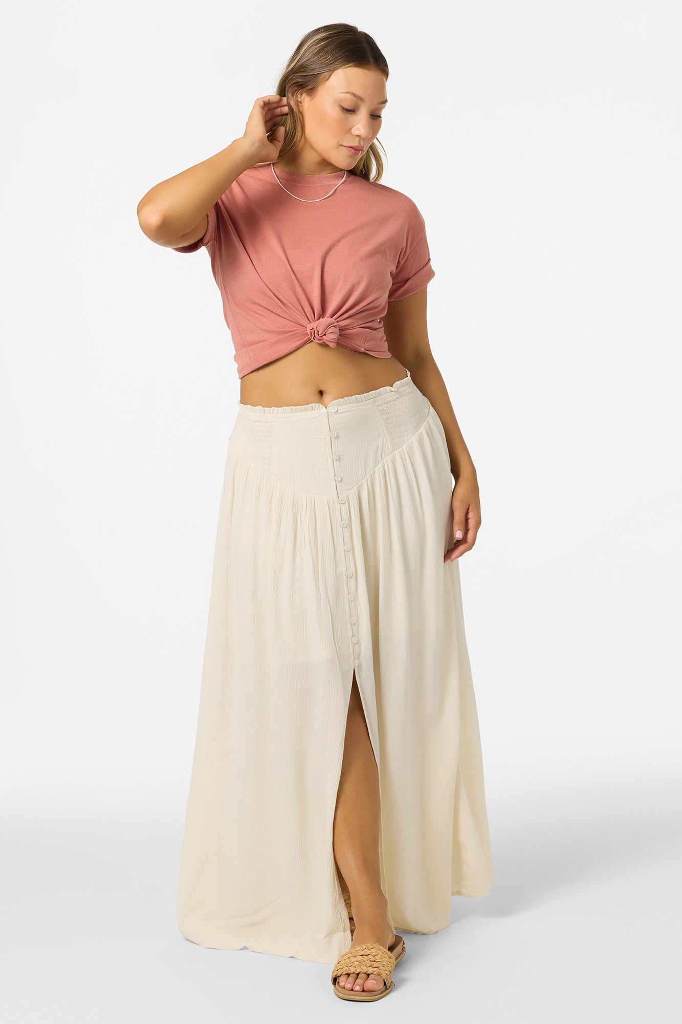Avec sa conception à enfiler et son tissu léger, cette jupe devient votre nouvel incontournable. Elle présente un devant boutonné et des détails en tissu froissé.