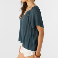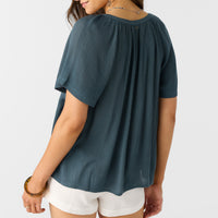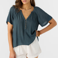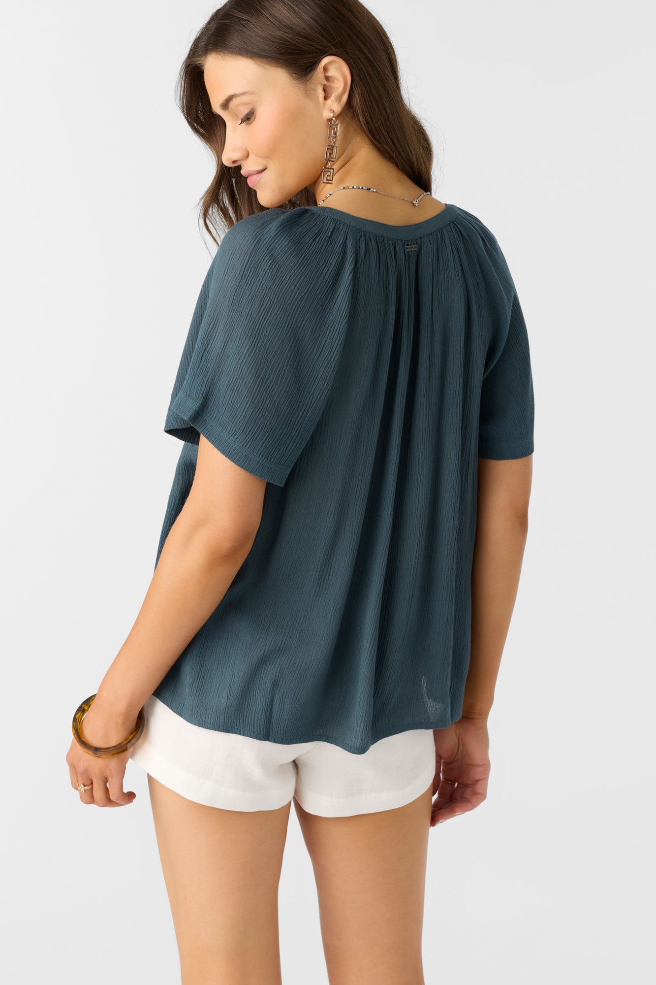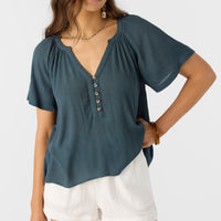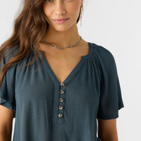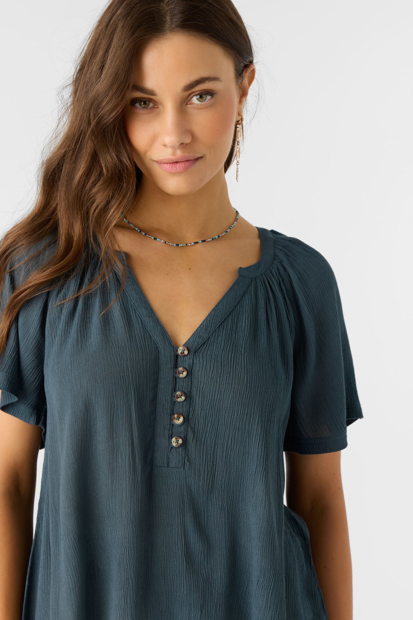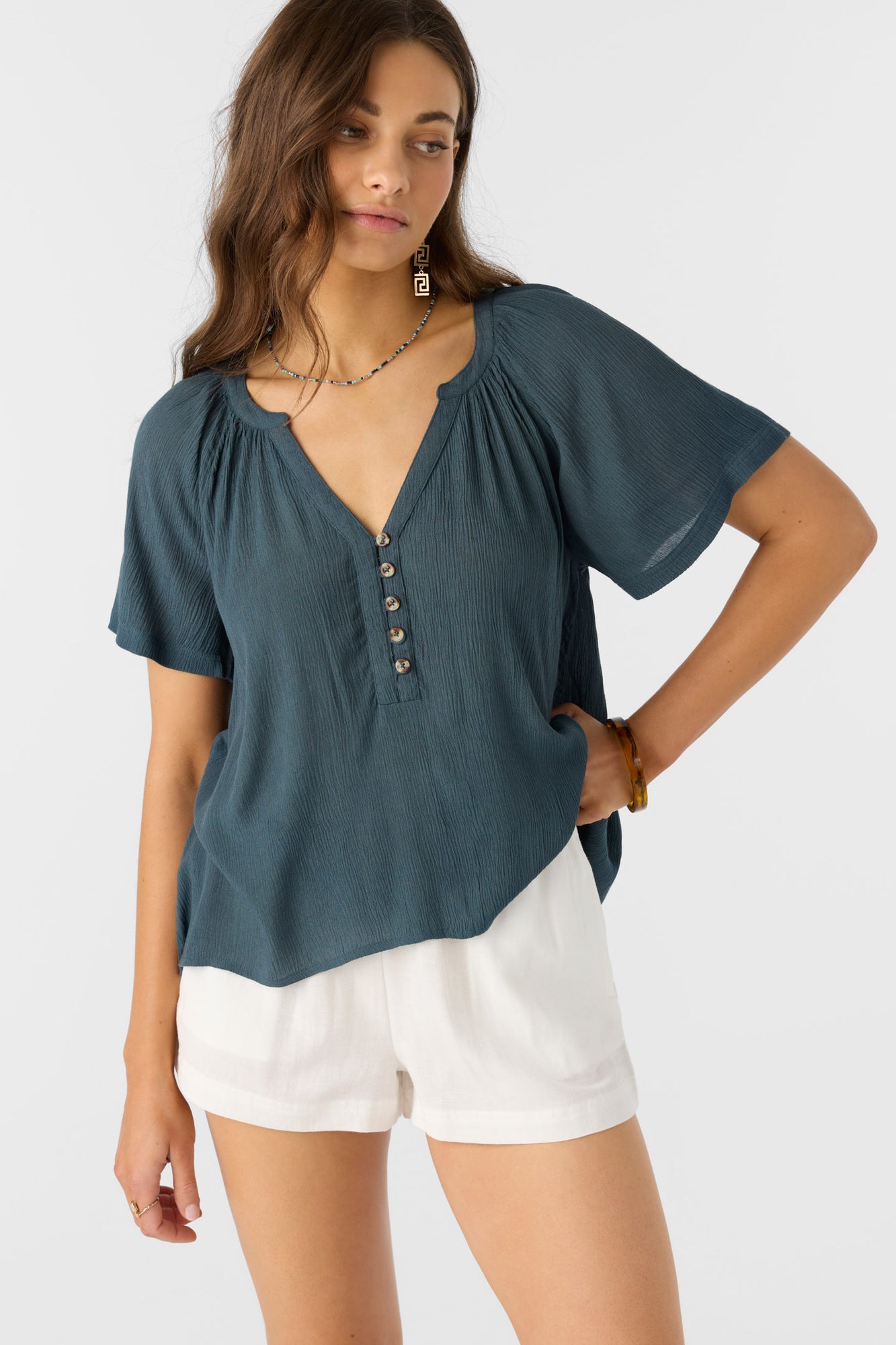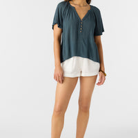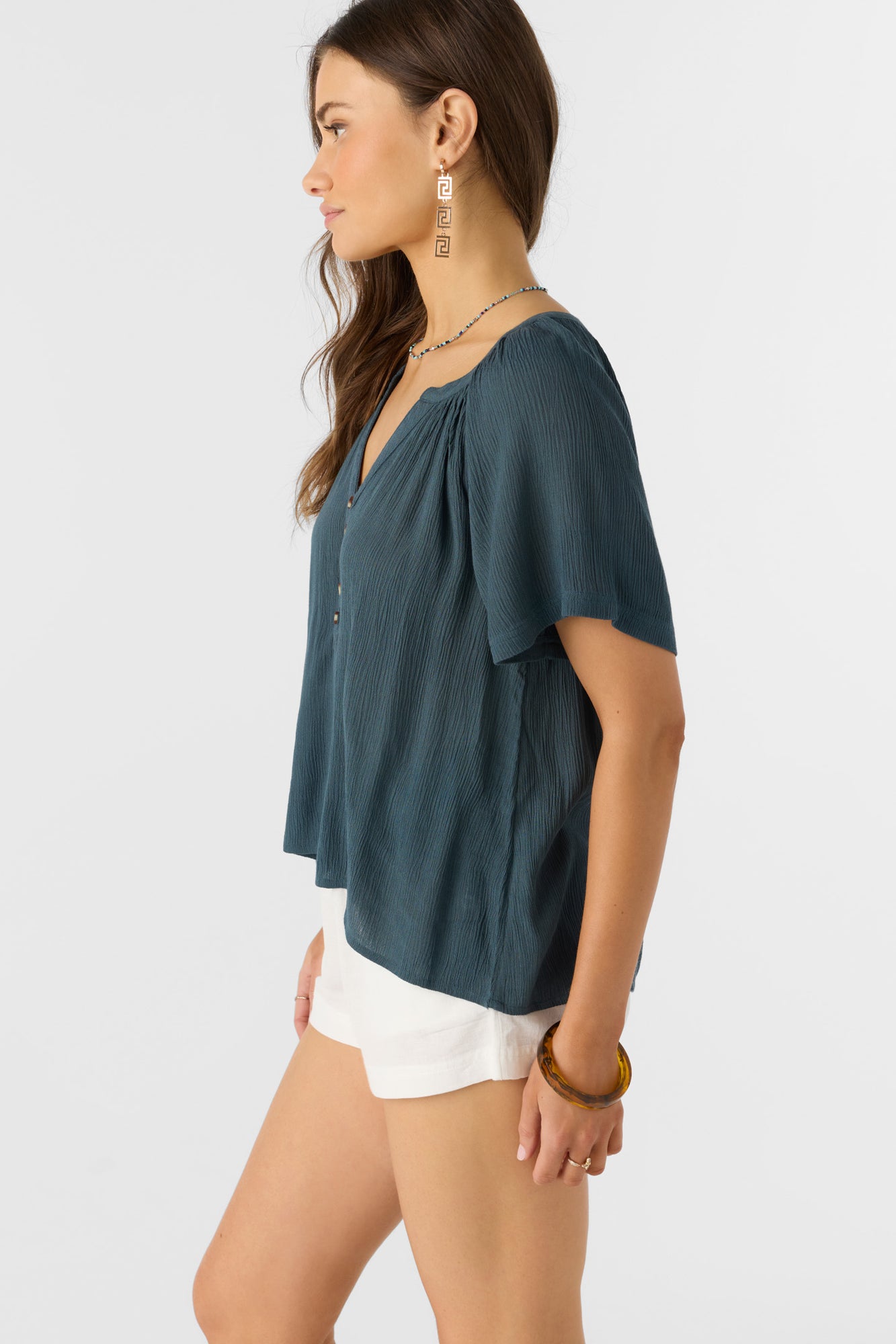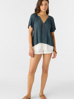 Cute and casual woven top that has a front v-neckline with button closure, high to low hem and solid color wash.