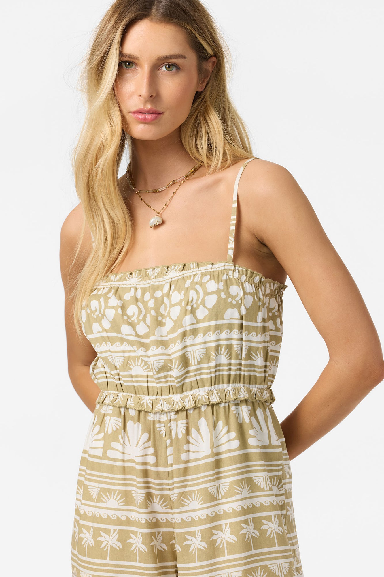 A cute printed romper perfect for beach days or a stroll through town. Complete with ruffle details, and elastic at waist and neckline for comfortable fit.