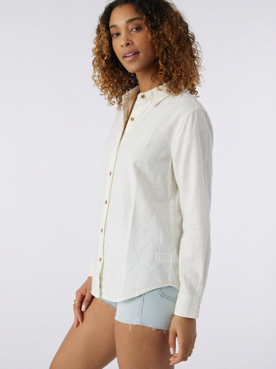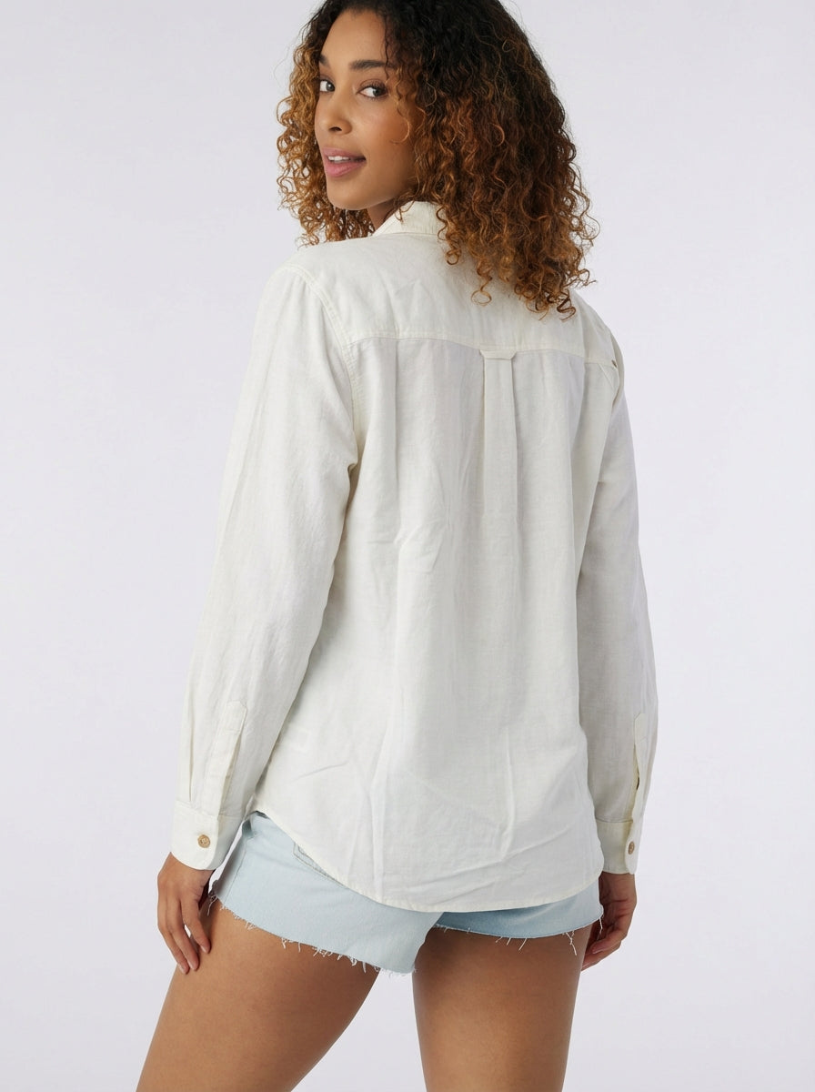 Stylish, breathable, and designed for comfort, the O’Neill Sanders Woven Long Sleeve Shirt is a versatile addition to your warm-weather wardrobe. Made from a soft, lightweight blend of 55% viscose, 30% cotton, and 15% linen, it offers a cool, airy feel perfect for layering or wearing on its own. This long sleeve button-up shirt features sleeve cuffs with button plackets for adjustable styling and a saddle cut for a relaxed, flattering fit. Ideal for casual outings, beach days, or pairing with your favorite shorts or pants, it combines classic design with modern comfort.